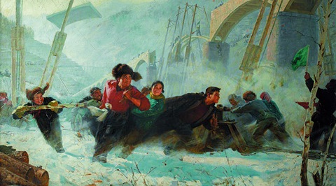 ritrae la marcia comunista per Pechino in modo realista ma con sfondo tipico
