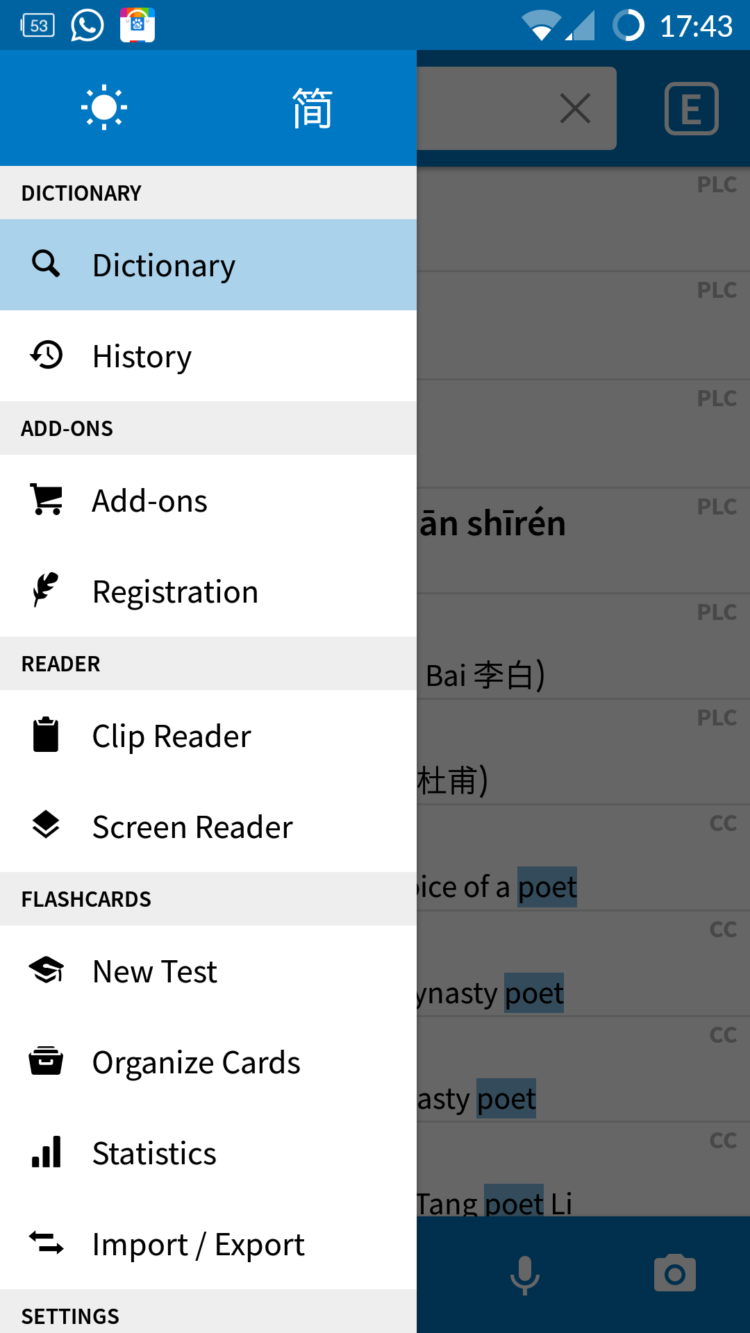 Qui elencherò altre funzioni di Pleco che secondo me sono importanti e interessanti. Tutte queste sono visibili accedendo al menù (simbolo delle tre strisce orizzontali accanto alla barra di scrittura)